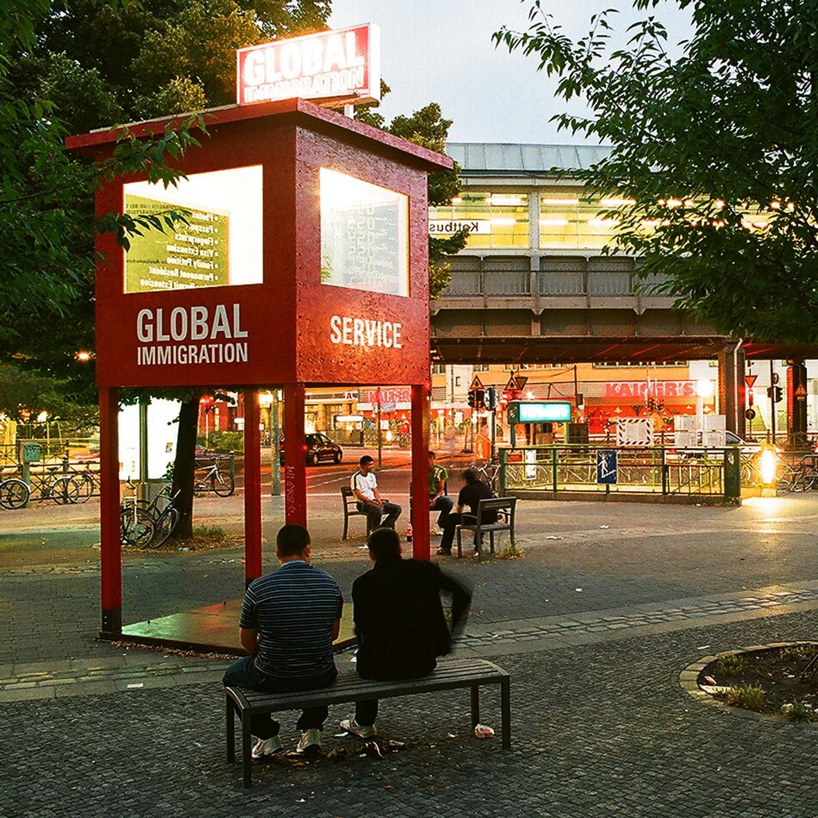 Dazu gibt es – in Zusammenarbeit mit der Transversale – auf dem Brunecker Rathausplatz die Kunstinstallation „global immigration service“ von Farida Heuck: